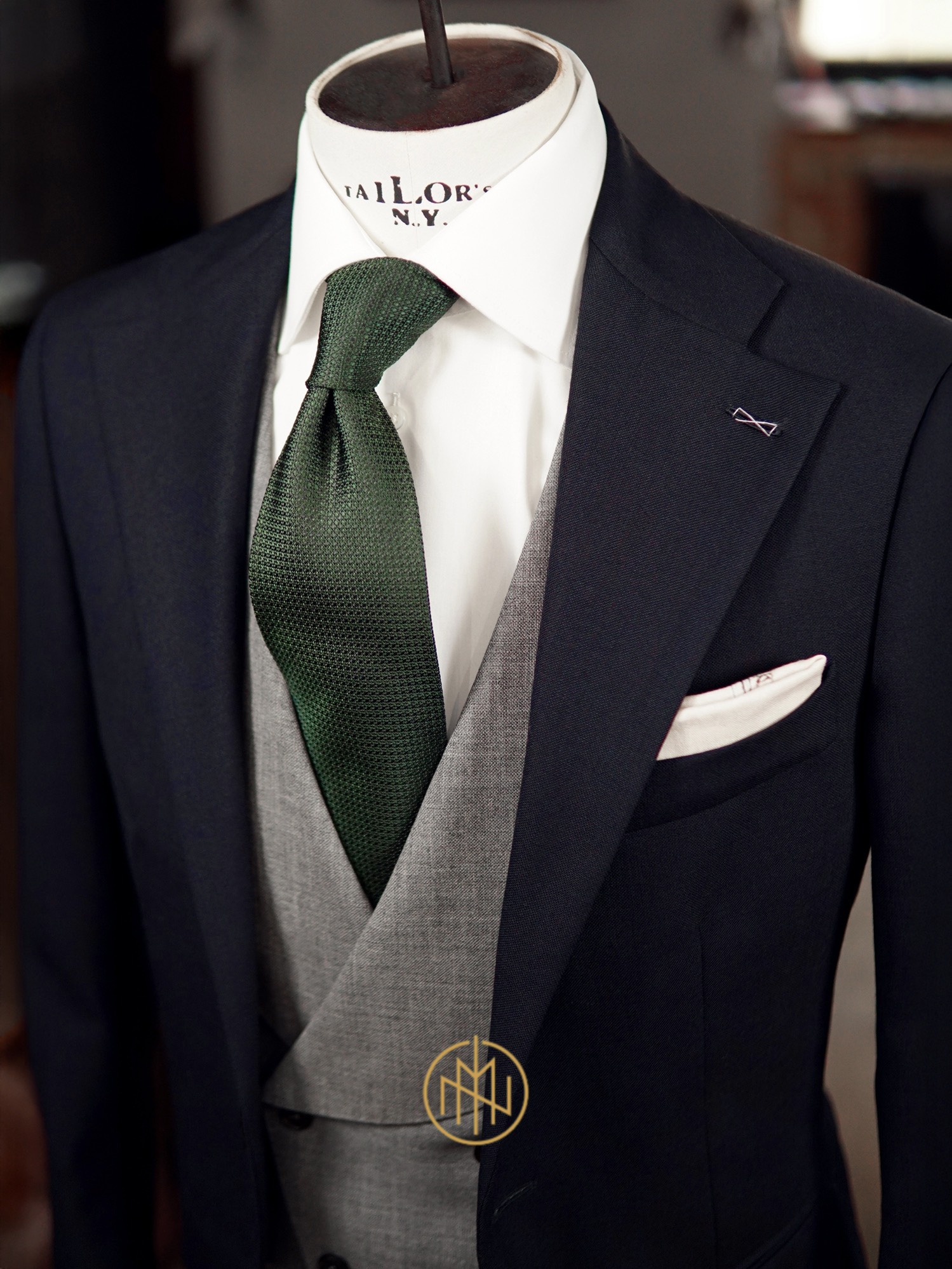 Pod szyję? Do takiego zestawu dorzuciliśmy krawat z butelkowozielonej grenadyny - faktura materiału nadaje tu prawdziwej głębi. Tłem dla całości jest biała koszula z szerokim, półwłoskim kołnierzem po łuku - naszym znakiem rozpoznawczym. Uszyliśmy ją z mięsistego, włoskiego twillu - tkaniny, która podkreśla powagę uroczystości.